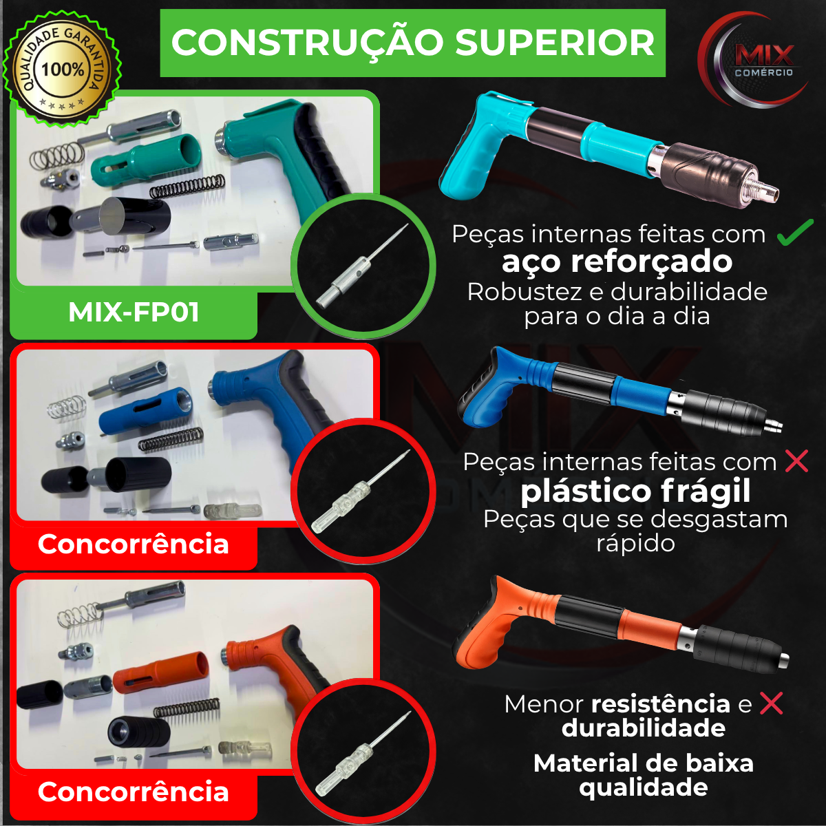 Nossa pistola de fixação é desenvolvida com materiais de alta resistência, garantindo maior vida útil e eficiência mesmo em trabalhos pesados.